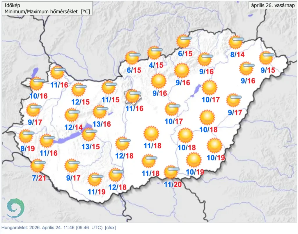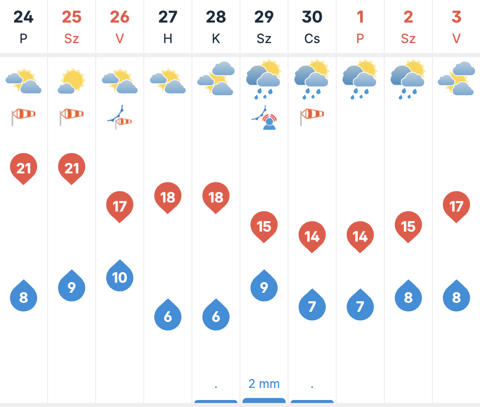 Az időjárás-előrejelzés szerint a vasárnapi hidegfront után platózik a maximumhőmérséklet néhány napig 17-18 fokon. Az újabb hidegfront majd szerdán éri el Magyarországot, ami akkor záport is hoz magával.
