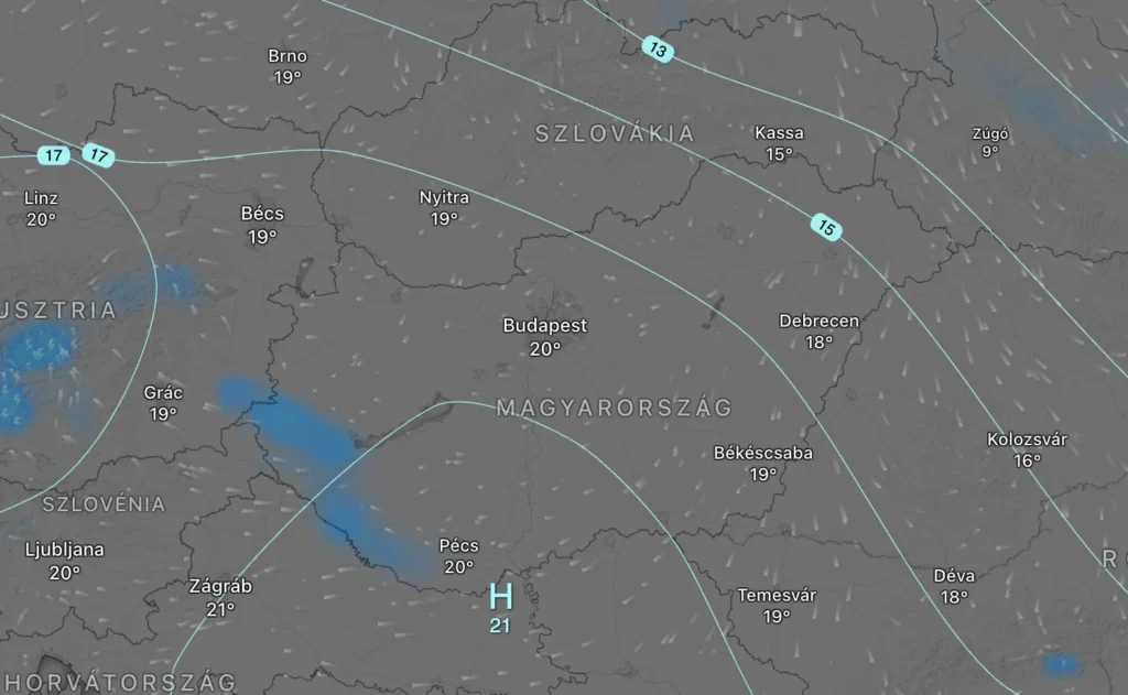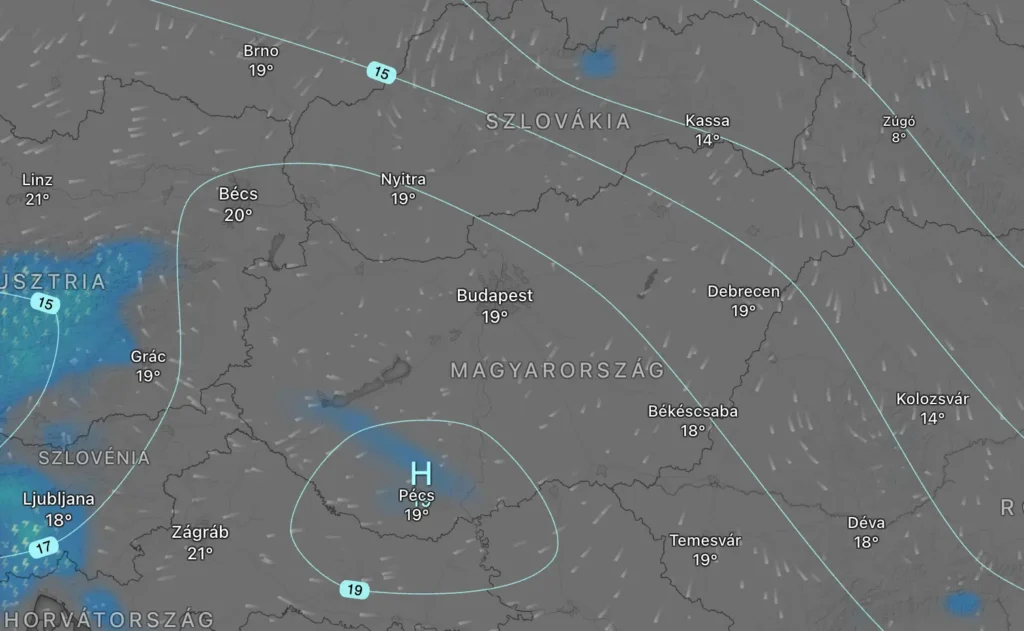A Windy.com térképén pontosan látszik, hogy 11 órától kell arra számítani, hogy besodródnak a csapadékot hozó felhők az ország fölé.