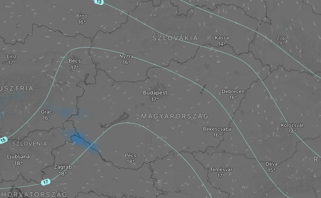 A Windy.com térképe azt mutatja, hogy 12 és 15 óra között nagyjából ugyanazon terület felett tanyázik majd a csapadékzóna, majd 16 és 18 óra között kissé keletebbre húzódik az ország délnyugati sarkából, utána viszont teljesen megszűnik az eső lehetősége.