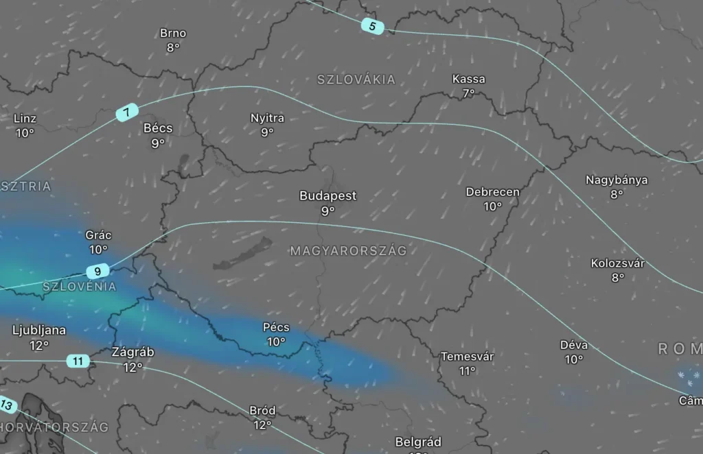 Hajnali 5 órára már egészen Pécsig húzódik a csapadékgóc és a délnyugati határ mentén élők kora reggel biztosan számíthatnak esőre. A szín alapján 1-2 mm-nél nem lesz több.