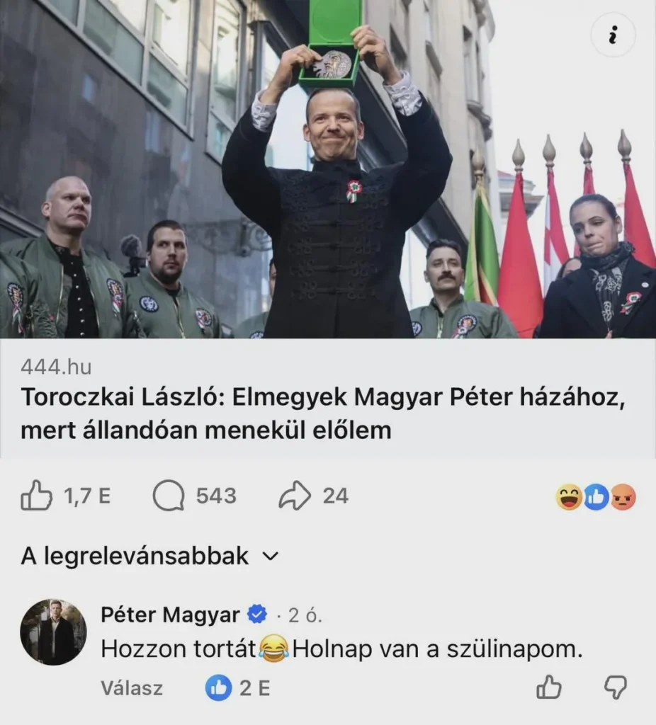 Ez a képernyőfotó magáért beszél. Magyar ezzel a kommenttel üzente meg, ő bizony nem tart Toroczkai Lászlótól, a Mi Hazánk elnökétől.