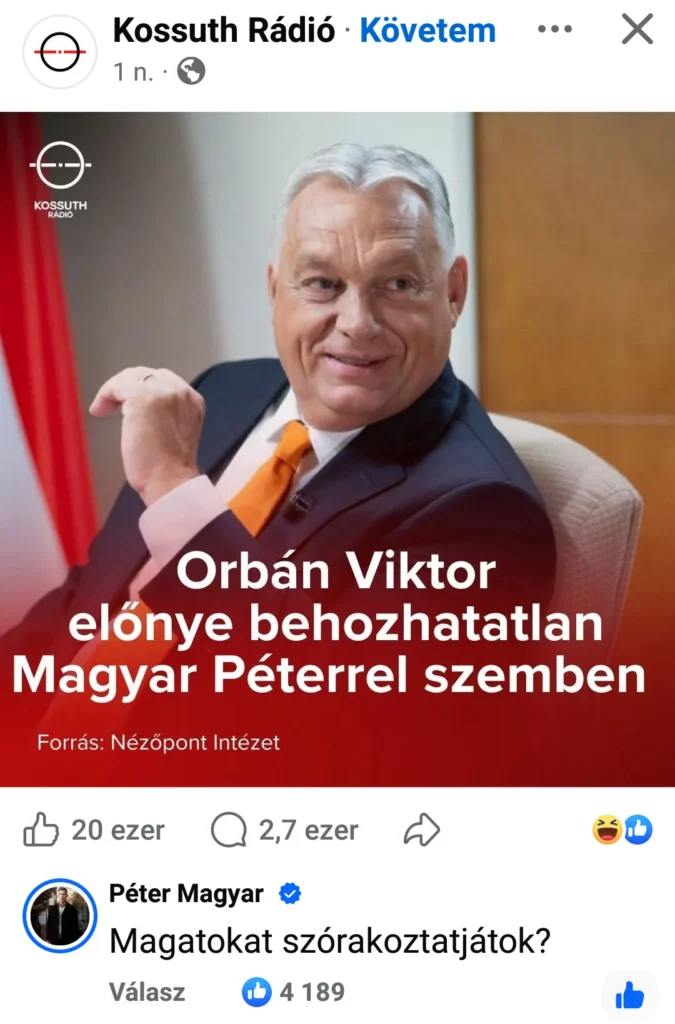 A közmédia különböző csatornáin, így például a Kossuth rádió Facebook-oldalán is rendszeresen jelentek meg olyan kormányközeli közvélemény-kutatások, amelyek a Fidesz behozhatatlan előnyét mutatták az elmúlt időszakban is. Mint utólag kiderült, ezek köszönőviszonyban sem voltak a valósággal. Magyar erre hívta fel a figyelmet.