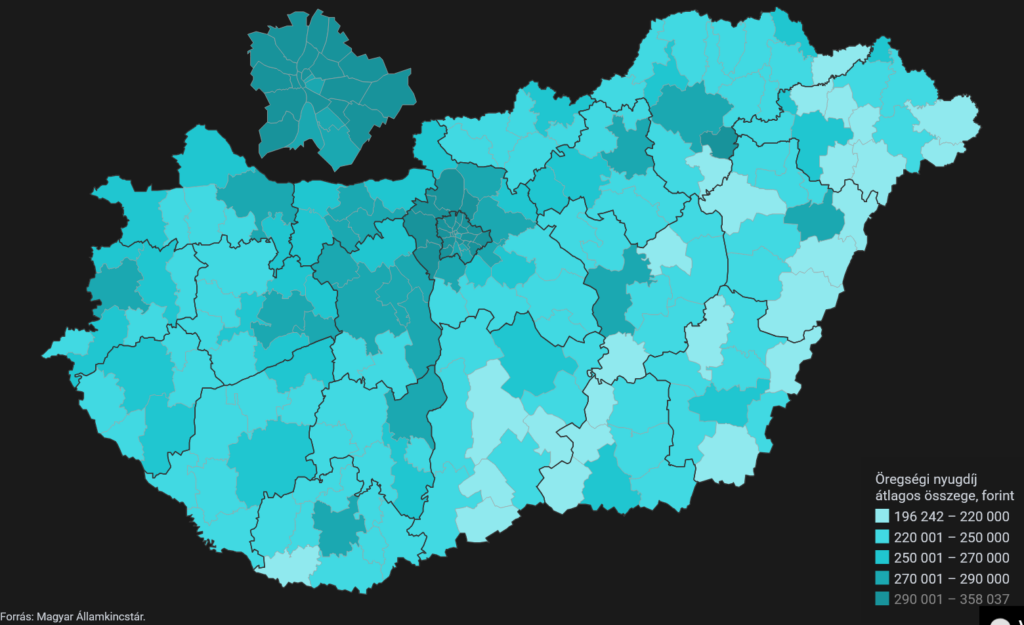 A legkevesebbet Dél-Alföldön a mórahalmi, a kisteleki és a kiskőrösi, továbbá az észak-alföldi csengeri járásban kapták a nyugdíjasok. Ezekben a térségekben még a 200 ezer forintos átlagot sem érték el a nyugdíjak.