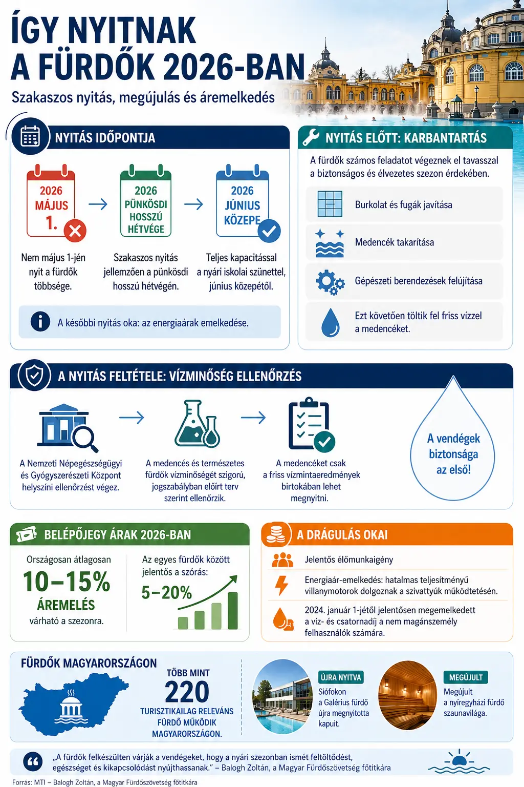 Teljes kapacitással a nyári iskolai szünettel, június közepétől működnek majd a fürdők. Addig számos karbantartási feladatot kell elvégezniük az üzemeltetőknek. Tavasszal javítják a burkolatot, a fugákat, takarítják a medencéket, újítják fel a gépészeti berendezéseket. Ezt követően töltik fel friss vízzel a medencéket – mondta a főtitkár.