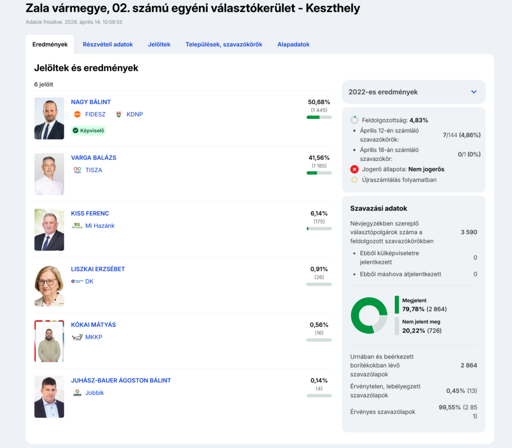 Újraszámlálást kellett tartani a Keszthely-központú választókerületben, miután az első két helyezett között száznál kisebb szavazatkülönbség alakult ki. A Tisza jelötje 59 szavazatos előnyben volt, ezért a Fidesz indulója kezdeményezte a szavazatszámlálás megismétlését.