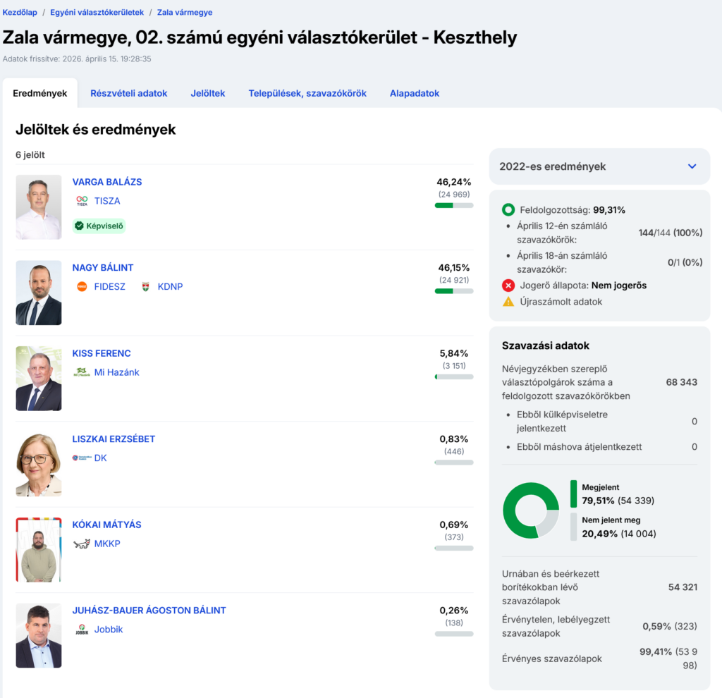 A szerda estig elvégzett újraszámlálás Varga Balázs előnyével zárult. A Tisza Párt jelöltje 24.969 szavazatot kapott, amely a voksok 46,24%-át jelenti. Ellenfele, a hivatalban lévő Nagy Bálint közlekedési államtitkár 24.921 szavazatot kapott, amely 46,15%-os szavazatarányt jelent. A különbség 48 voks, a szavazatok 0,09%-a! – derült ki a Nemzeti Választási Iroda által működtetett valasztas.hu-ról. Ez azt jelenti, hogy az újraszámlálás nyomán 11 szavazattal csökkent a különbség a vasárnapi szavazatszámláláshoz képest, de továbbra is a tiszás Varga Balázs maradt az élen.